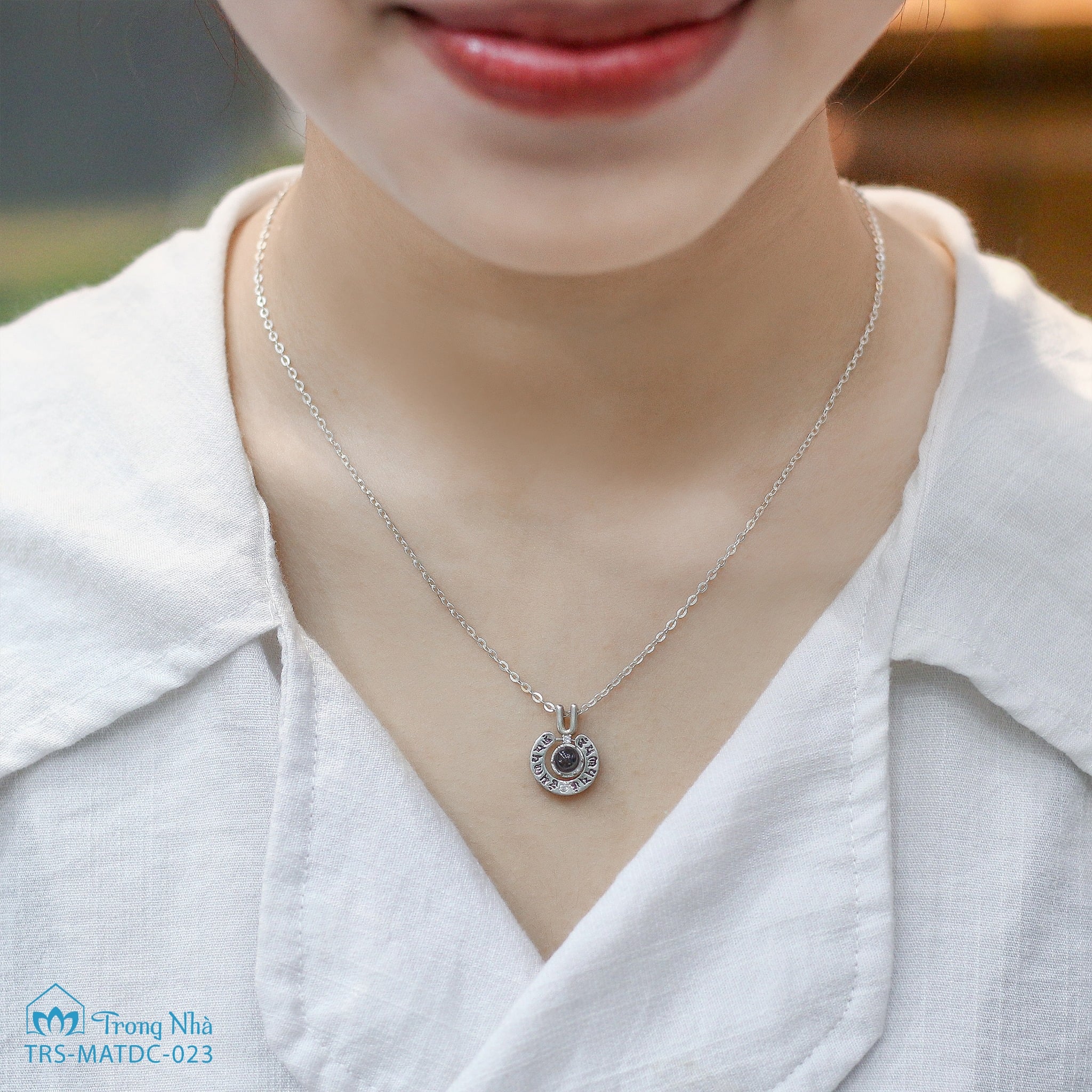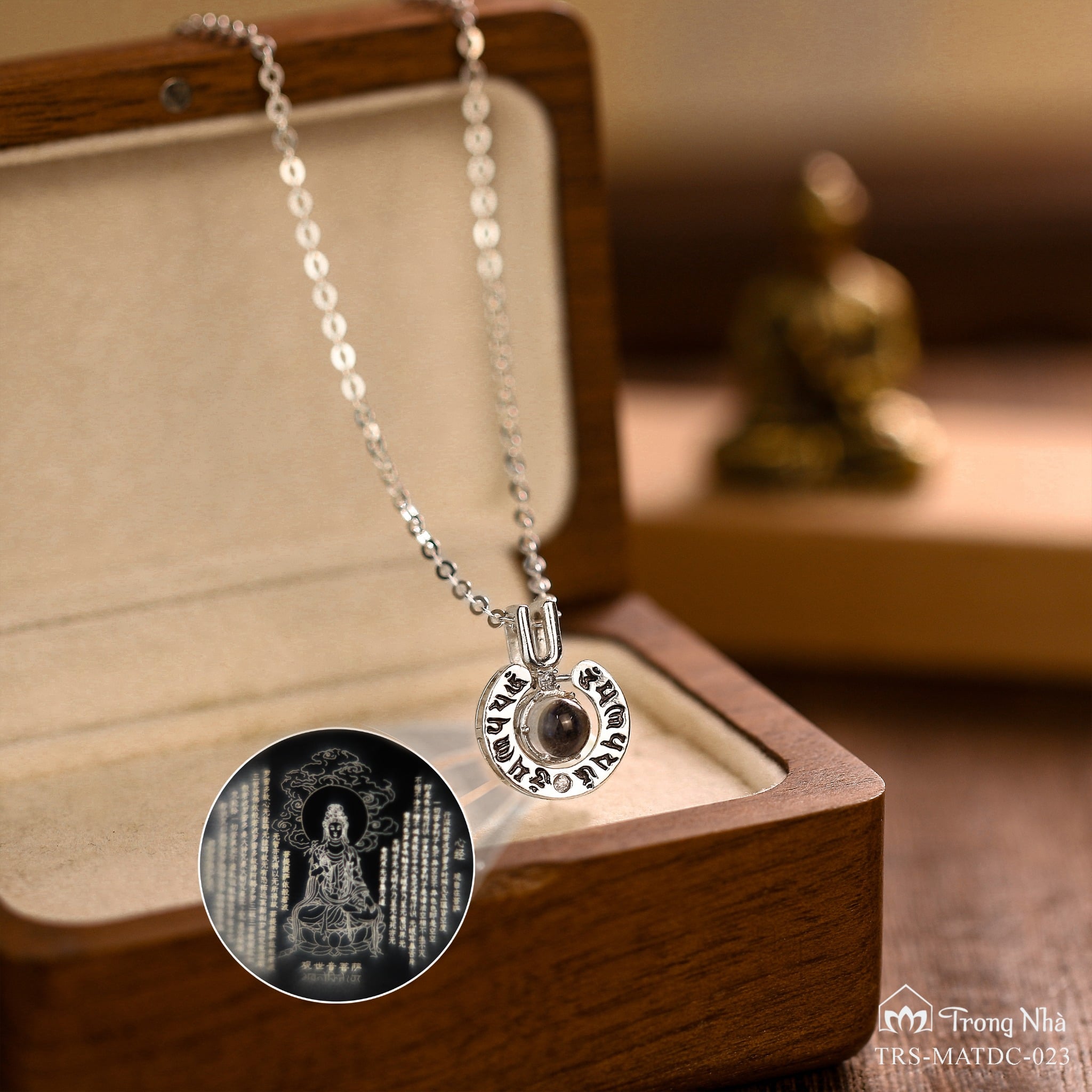 Dây chuyền được thiết kế độc đáo: Khi soi ánh nhìn vào viên đá sẽ hiện ra hình Mẹ Quan Âm một cách kỳ diệu và toàn bộ bản Bát Nhã Tâm Kinh của Ngài. Bát Nhã Tâm Kinh là kinh cốt tuỷ của nhà Phật, giúp mọi người quán chiếu sâu vào tự tính của mình và nhận được hạnh phúc chân thật.