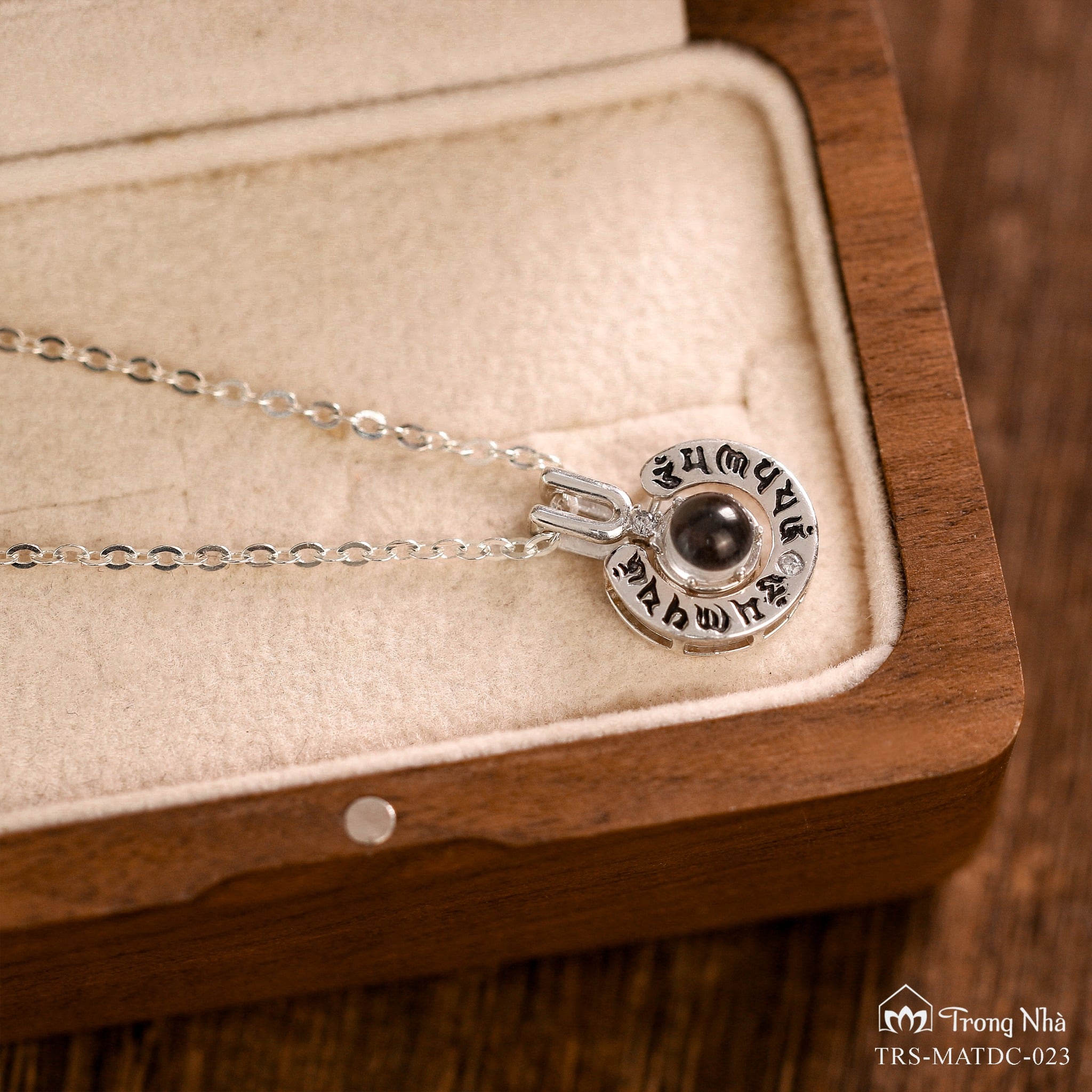 Chiếc dây chuyền được khắc thần chú Om Mani Padme Hum: Thần chú của Đức Quán Thế Âm Bồ Tát, là người đại diện cho lòng từ bi của vô số chư Phật. Nhờ lòng từ của Ngài mà rất nhiều chúng sinh được lắng nghe nỗi khổ và được cứu giúp để đi tới bến bờ của giải thoát. Nếu bạn đeo chiếc dây chuyền này, bạn sẽ được kết nối với lòng từ bi đó.