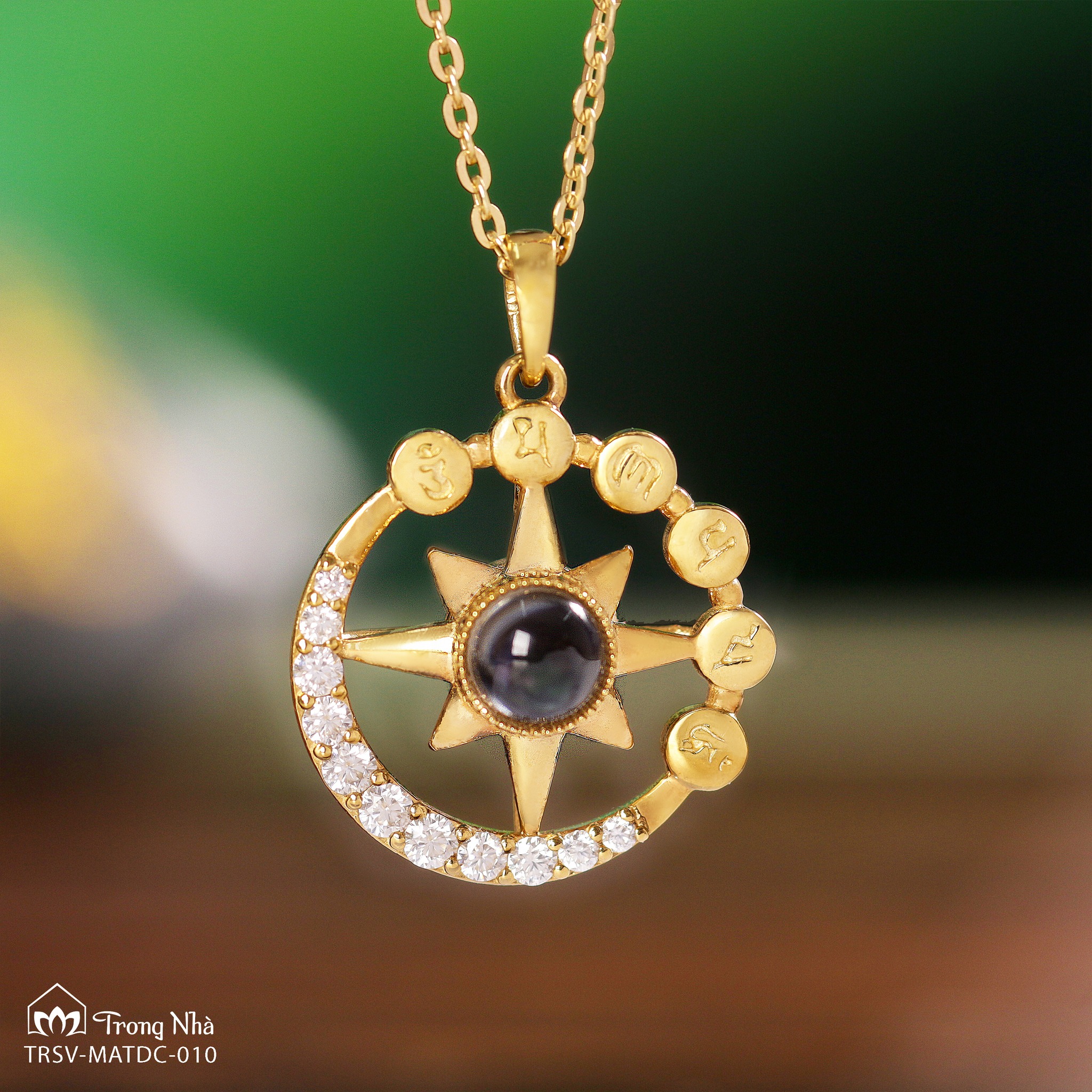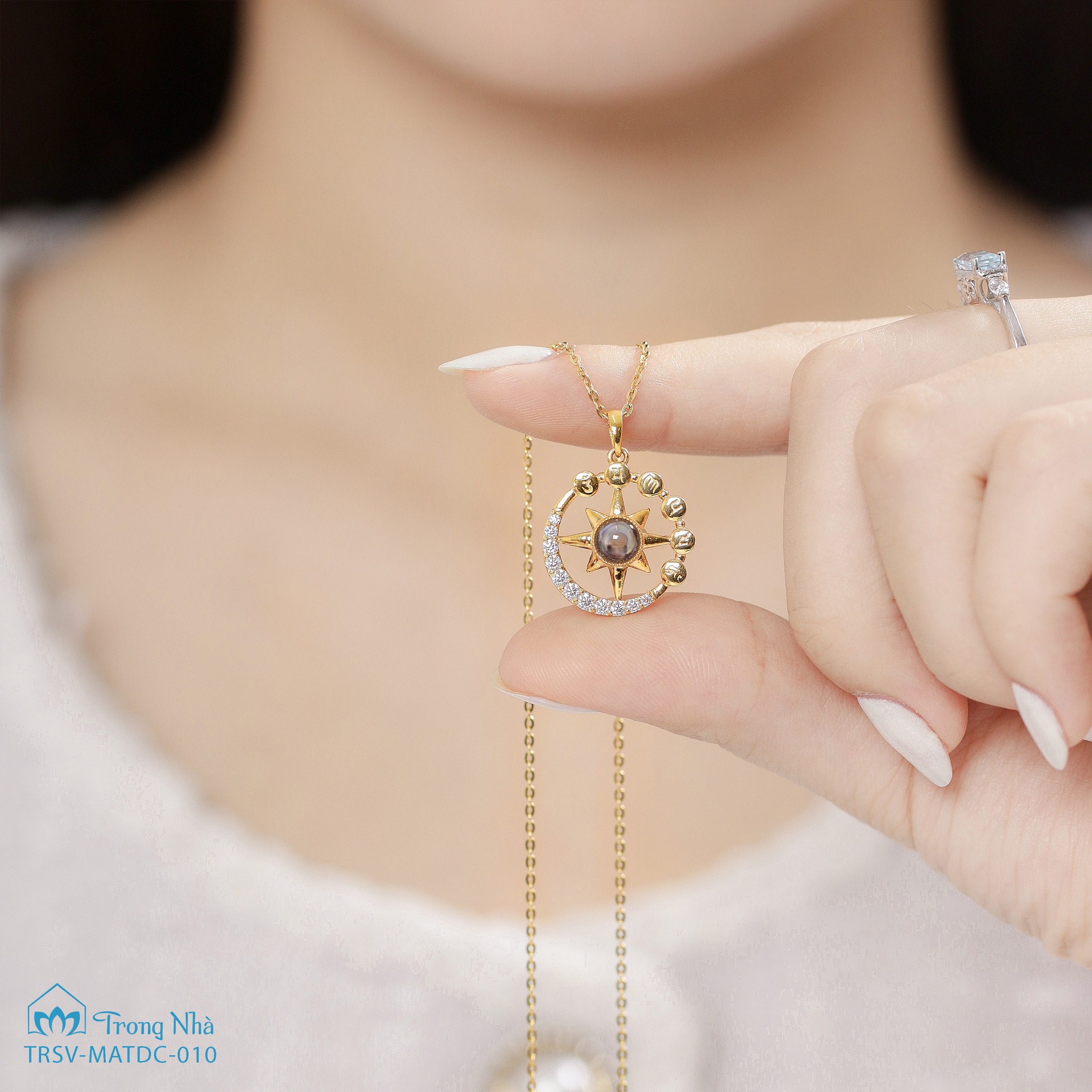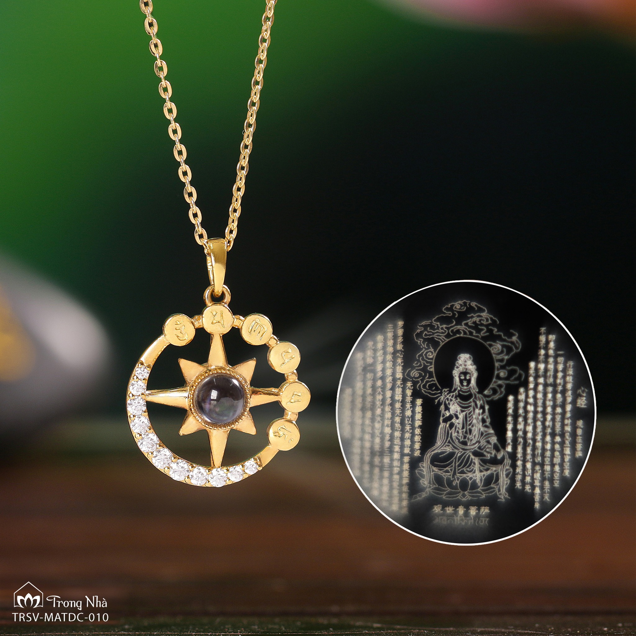 Với thông điệp này, Trong Nhà đã tạo nên bảo vật NHẬT NGUYỆT PHỔ CHIẾU - một sự kết hợp độc đáo giữa hình ảnh mặt trăng và mặt trời, biểu tượng của sự hài hòa giữa ánh sáng và bóng tối. Mặt dây được khắc thần chú "Om mani padme hum" - câu tâm chú của Đức Quan Thế Âm Bồ Tát, mang năng lượng từ bi và tình thương vô điều kiện. Đá Phổ Chiếu khắc hình Mẹ Quan Âm và Bát Nhã Tâm Kinh - bản kinh đại trí tuệ. Bởi chỉ khi có trí tuệ, ta mới có thể nhìn thấu bản chất của khổ đau, từ đó chấp nhận và ôm ấp lấy chính mình một cách trọn vẹn.