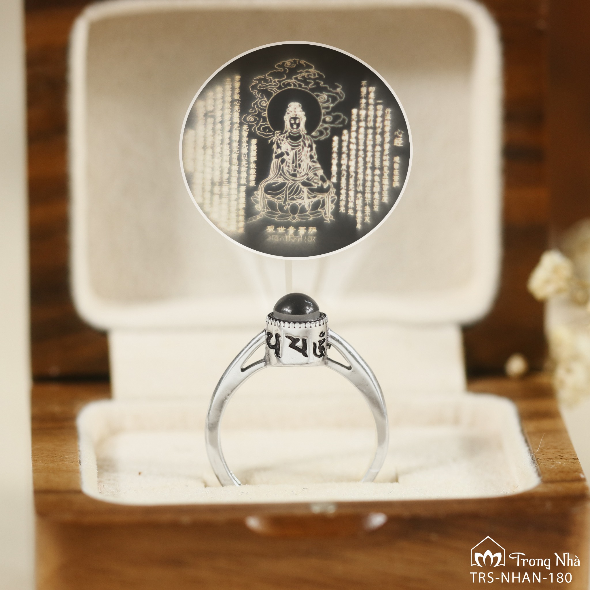Sản phẩm nhẫn " Bình An bên trong bạn" - đánh thức phật tính sẵn có trong mỗi người - soi chiếu hình ảnh từ bên trong, giúp mình nhận ra bình an nơi tâm mình. Mỗi khi đeo bạn sẽ được ngắm hình Quan Thế m Bồ Tát - vị bồ tát của tình thương làm bạn tràn đầy năng lượng ấm áp, yêu thương, và bạn được nhắc về Kinh Bát Nhã, nhận ra nguồn hạnh phúc vô điều kiện nơi bạn