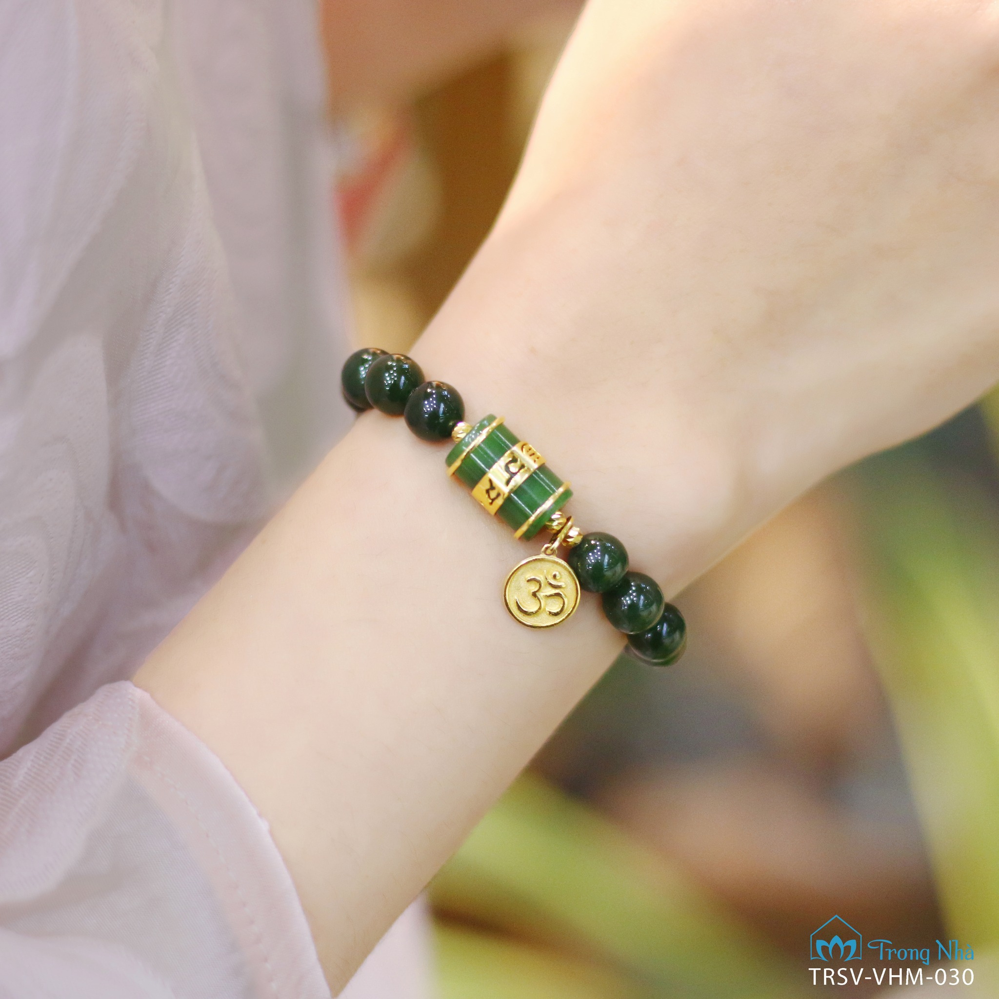 Những viên ngọc bích nhỏ xinh được kết cùng charm lu ngọc bọc vàng với câu tâm chú Om Mani Padme Hum mang năng lượng bảo vệ thân tâm của Đức Quán Thế Âm Bồ Tát. Tâm chú này được yêu chuộng nhất tại Tây Tạng khi nó được khắc trên đá, trên cánh cửa nhà, trong các hang động, các vật dụng trang sức đeo tay, cổ… để có thể nhắc nhở người đeo về hạnh phúc vô điều kiện đang có ở mọi nơi, bảo vệ mọi người mọi lúc.