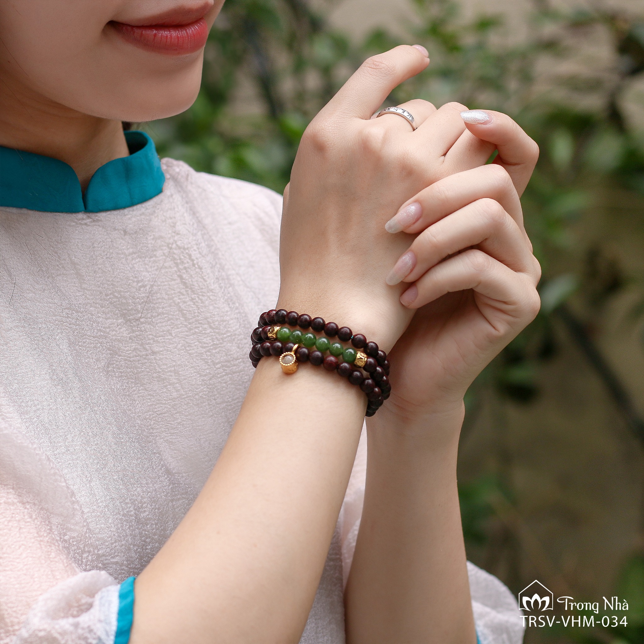“Vương Ngọc Phổ Chiếu” - bảo vật với sự kết hợp của gỗ tử đàn, ngọc bích, cùng charm chú Om Mani Padme Hum và viên đá Quan Âm Phổ Chiếu thiết kế riêng của Trong Nhà là người bạn đồng hành khích lệ bạn trên hành trình yêu mình để tự bảo vệ bản thân.